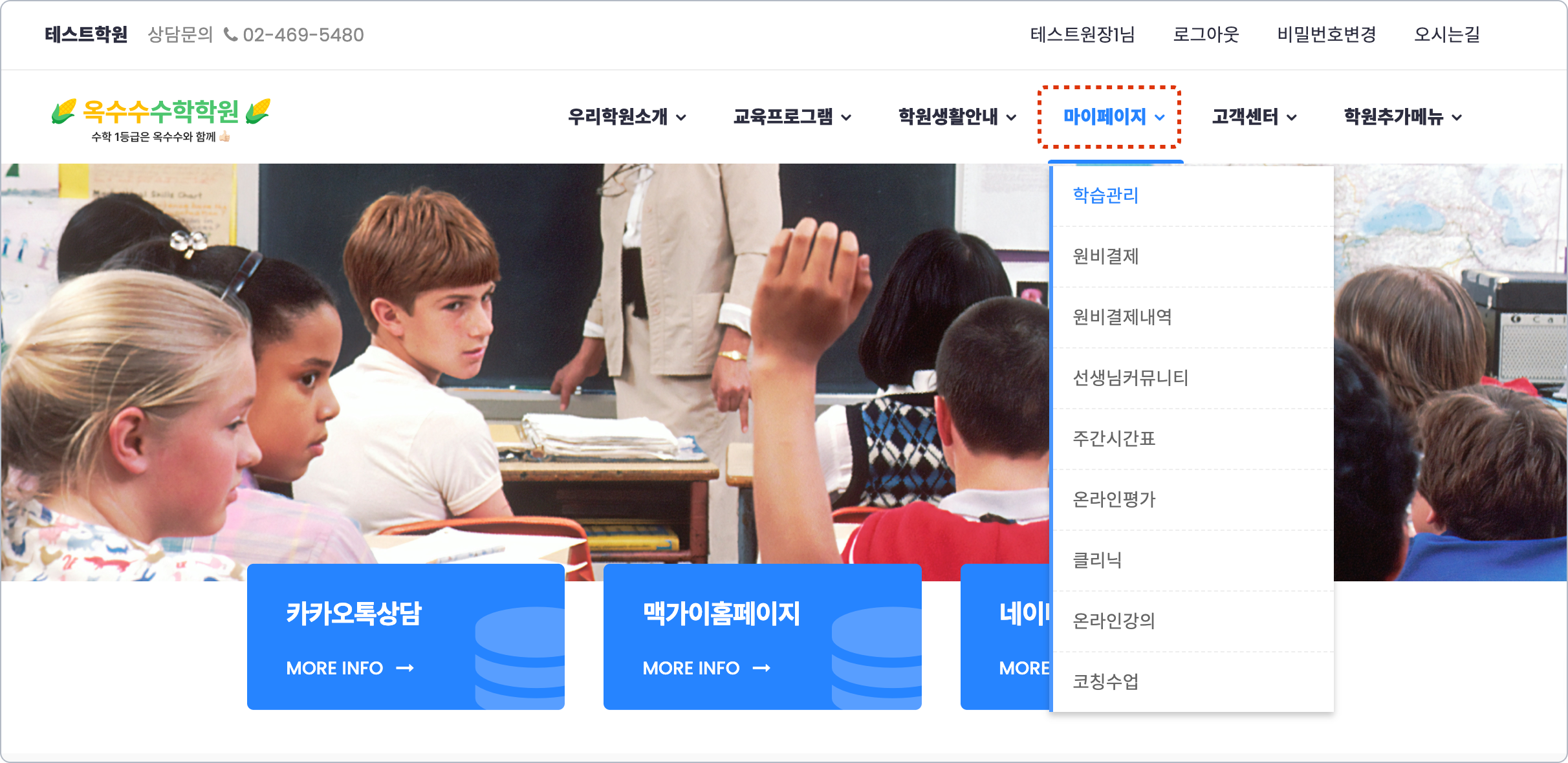 학원의 로고 이미지가 표시 됩니다. 로고 이미지를 누르면 메인 페이지로 이동할 수 있습니다.